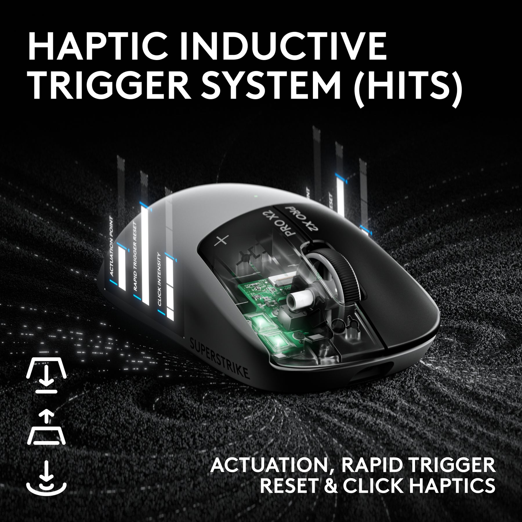 PRO X2 SUPERSTRIKE is a breakthrough in ultra-low click-latency technology. The revolutionary Haptic Inductive Trigger System (HITS) accelerates click speed with tunable actuation and rapid trigger reset points for both main mouse keys.