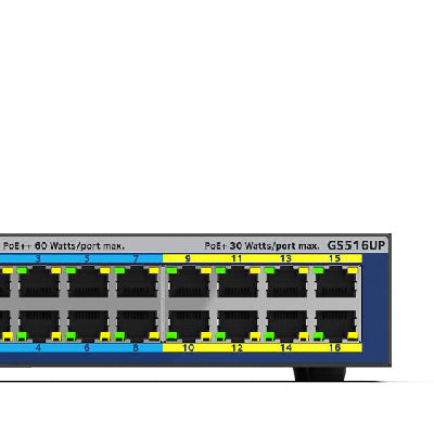 NETGEAR brings even larger PoE budgets on Unmanaged switches with Ultra60 PoE++ technology with the new 16- Port (GS516UP) Unmanaged Switches, ideal for powerful PoE+/PoE++ installations with impressive PoE budgets up to 380W, a compact size, plug-and-play installation, and reliable performance at affordable prices. These switches can support all types of PoE installation with larger PoE budgets and ports that provide PoE+ and PoE++ power for up to 60W per port. Standardized to IEEEE 802.3bt, the Ultra60 PoE++ switches can deliver up to 60W of power per port, allowing the connections of higher power required devices, such as high-performance 802.11AX wireless access points, PTZ and 4K IP surveillance cameras, PoE lighting, PoE-powered audio speakers, as well as other high-powered devices. The GS516UP has a PoE mode used to enable pre-802.bt compatibility for pre-bt devices that were created before 802.3bt Standard was ratified.