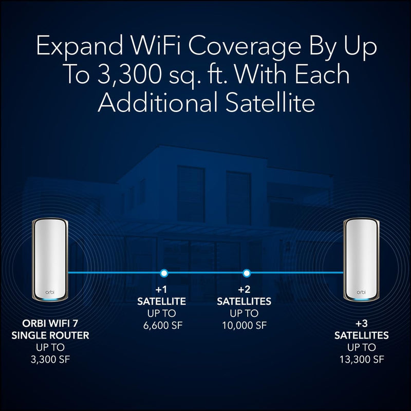 Expanding your Orbi™ system is as easy as the push of a button. Easily add 3,300 sq. ft. of additional WiFi 7 coverage to your existing Orbi 970 Series mesh system or router.