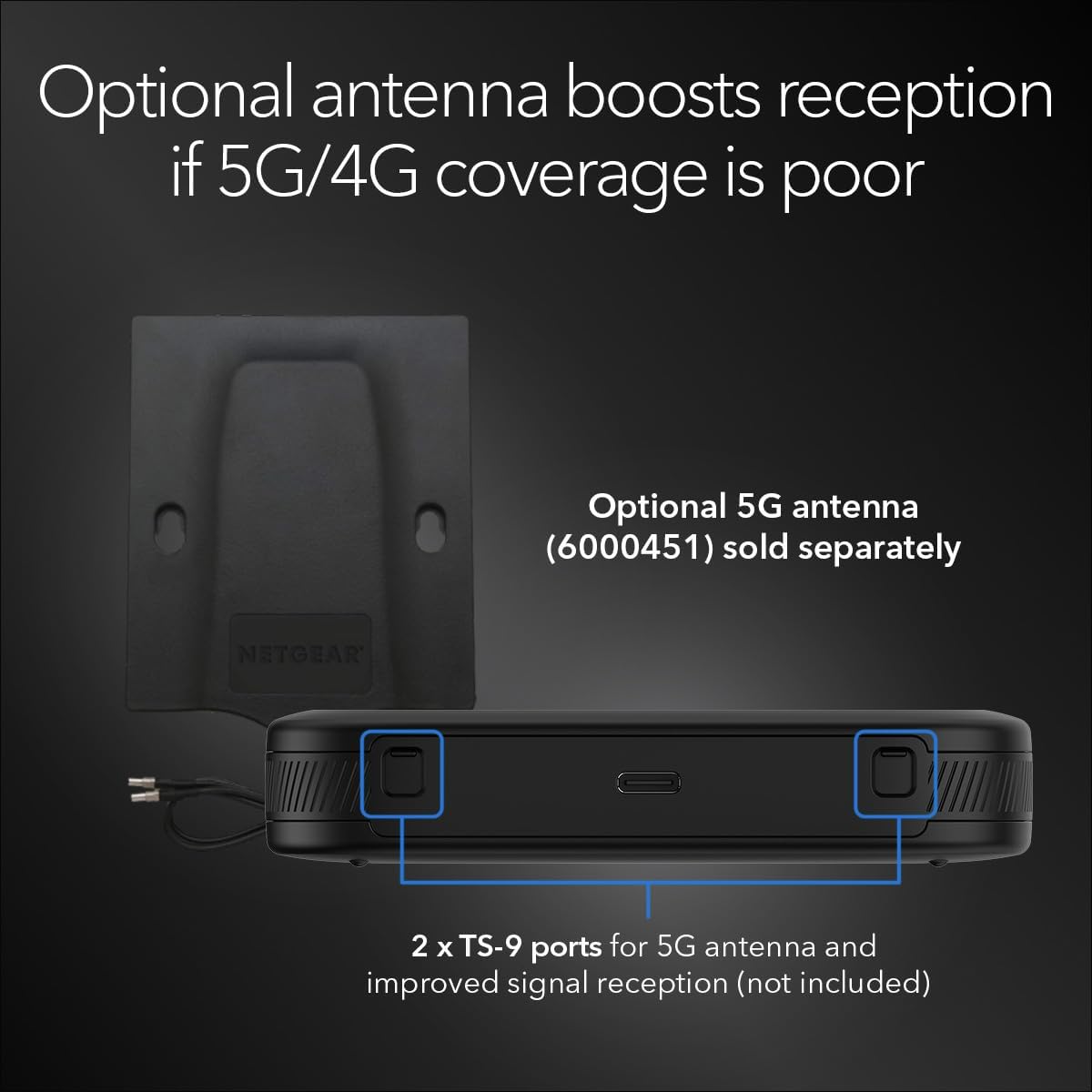 Enhance 5G/4G reception in buildings, vehicles, or remote areas with limited network coverage by connecting an external antenna to the two TS-9 ports (optional).