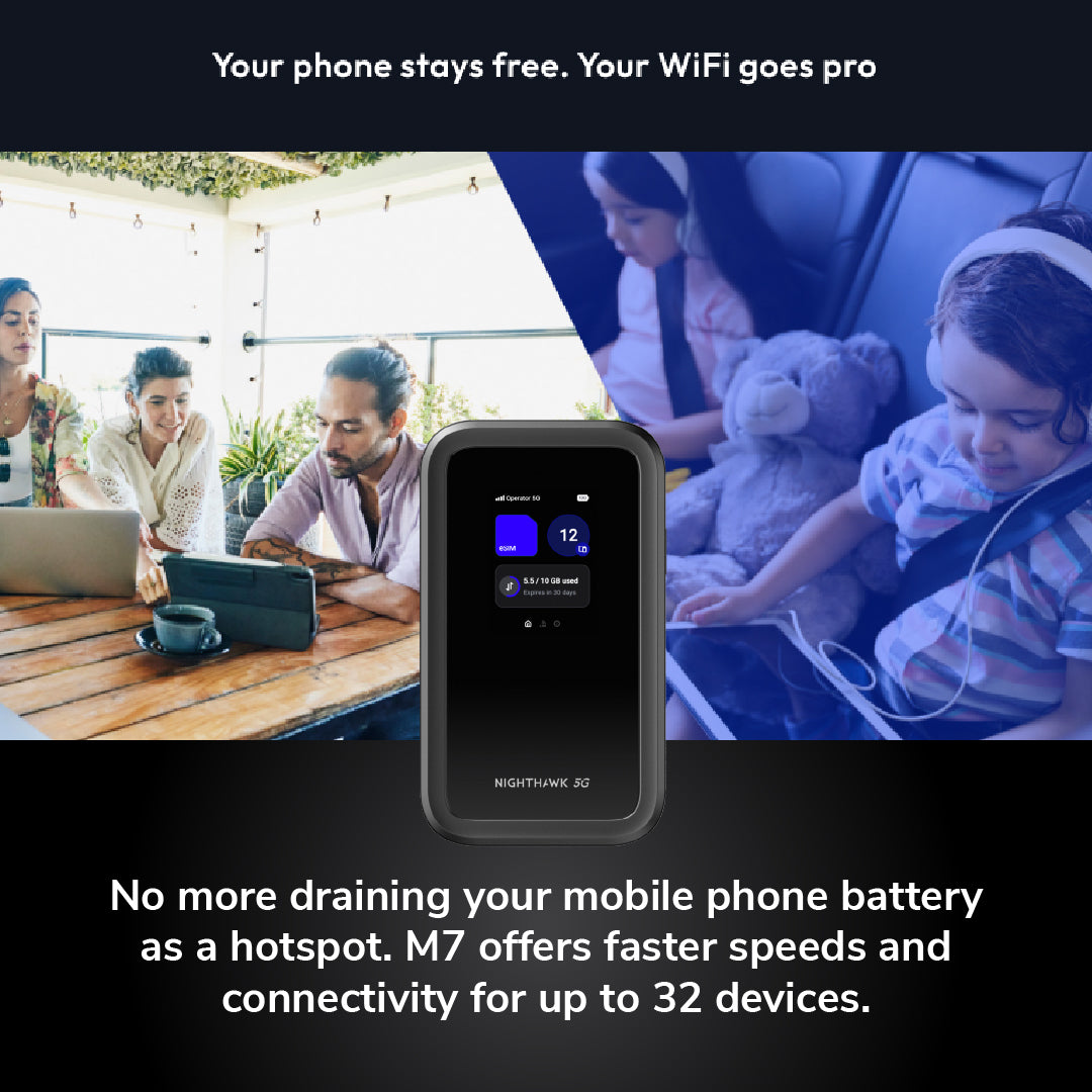 Experience a new class of performance. Phone hotspots can struggle to perform with one laptop - M7 effortlessly powers your entire family or team with WiFi 7 speeds up to 3.6 Gbps.